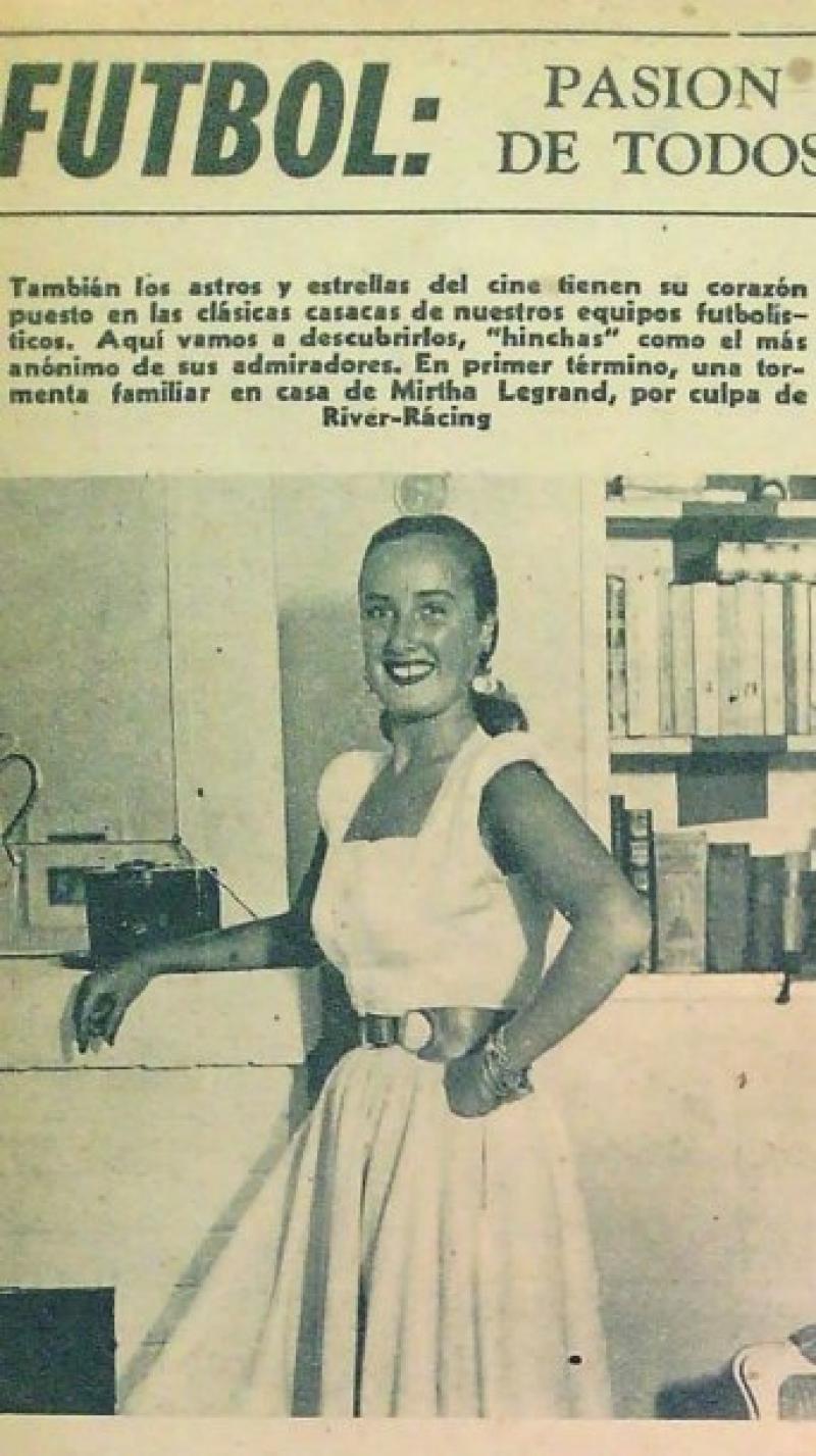 "También los astros y estrellas del cine tienen su corazón puesto en las clásicas casacas de nuestros equipos futbolísticos. Aquí vamos a descubrirlos, ‘hinchas’ como el más anónimo de sus admiradores. En primer término, una tormenta familiar en casa de Mirtha Legrand, por culpa de River-Racing", afirma la nota junto a la foto de una joven Legrand.