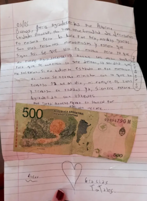 La joven publicó también dos fotos donde se puede leer con precisión el mensaje que le escribió el empleado y el billete verde de $500 que le obsequió por su gesto. “Quería agradecerles por haberme cuidado anoche, no tuve la oportunidad de decirles por persona, pero lo haré por acá. Muchas gracias, son unas personas maravillosas y espero que sigan así”, expresó el muchacho al comienzo de la carta.