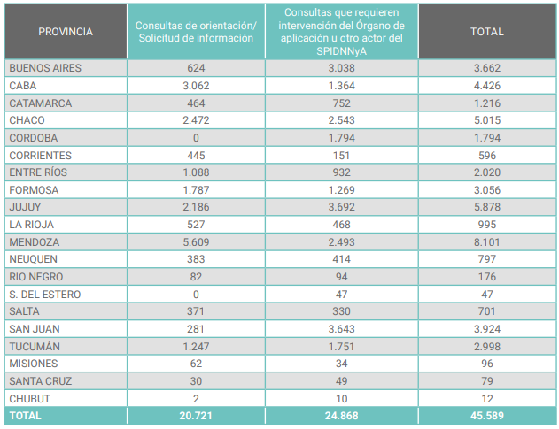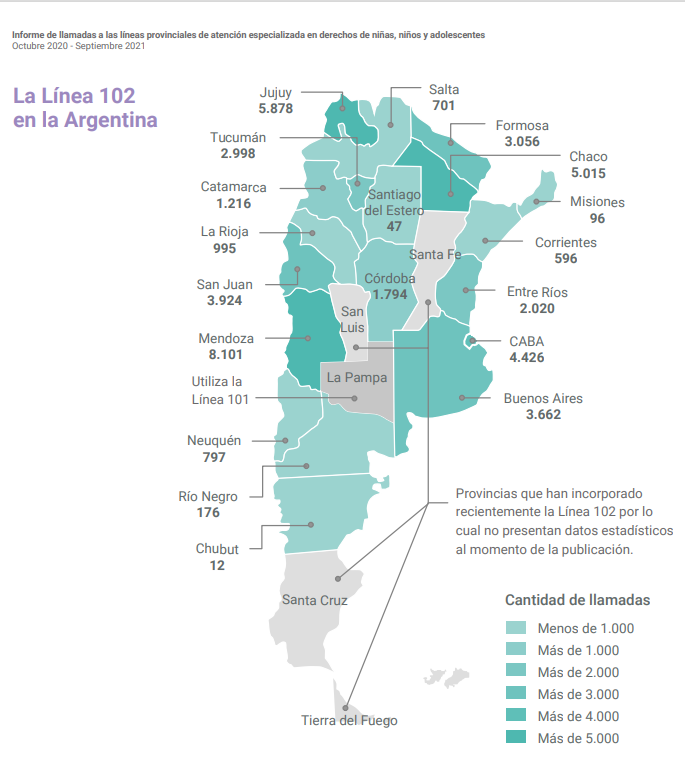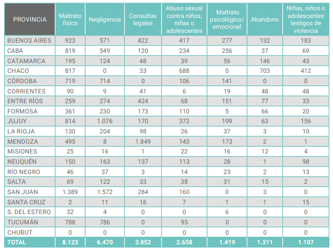 En el informe que publicó recientemente la Secretaría Nacional de Niñez, Adolescencia y Familia (SENAF), organismo rector de las políticas públicas de niñez y adolescencia, se ve que entre octubre de 2020 y septiembre de 2021, en los primeros lugares se ubican Mendoza (8.101 llamados), Jujuy (5.878), Chaco (5.015), CABA (4.426) y San Juan (3.924).