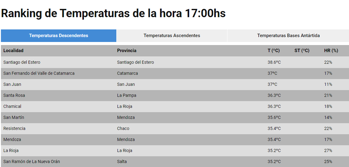 El ranking de temperatura, que toma registros de las distintas estaciones meteorológicas del país, advirtió que a las 17 las ciudades más cálidas del país eran la capital de Santiago del Estero (38.6º), en tanto que San Juan y San Fernando del Valle de Catamarca completaron el podio con 37 grados.