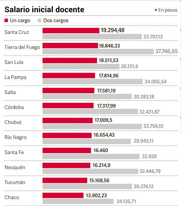 Santa Cruz y Tierra del Fuego son las provincias donde más ganan los docentes en términos nominales, es decir, sin considerar lo que cuesta allí el costo de vida. Santa Cruz es la que más paga por un cargo. Un joven que recién se recibe y se inicia en la profesión recibe $ 19.294,48 por media jornada, lo que representa un 30% más que lo que recibe un maestro que comienza a trabajar en Capital y en Provincia; y casi el doble que el básico de un docente de jornada simple en Santiago del Estero ($ 10.632), el distrito que menos paga a los maestros.