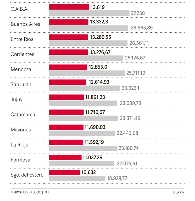En este relevamiento, San Juan se ubica en la posición 18 con un sueldo básico de $12.614,93, por debajo del salario de un docente mendocino $12.855, 60 y por encima de un maestro de Jujuy que llega a los $11.861,23.