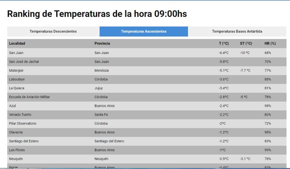 De acuerdo al informe del organismo, mientras el termómetro registraba 6.4 grados bajo cero de temperatura real, la sensación térmica era de 10 grados bajo cero, la temperatura más fría del país. En el ránking que arma el SMN, los dos primeros puestos eran para la provincia, primero con el Gran San Juan, y segundo con Jáchal. La tercera localidad con más bajas temperaturas era Malargüe, en Mendoza, con un registro de 5.1 grados bajo cero y una sensación térmica de 7.7 grados, también bajo cero.
