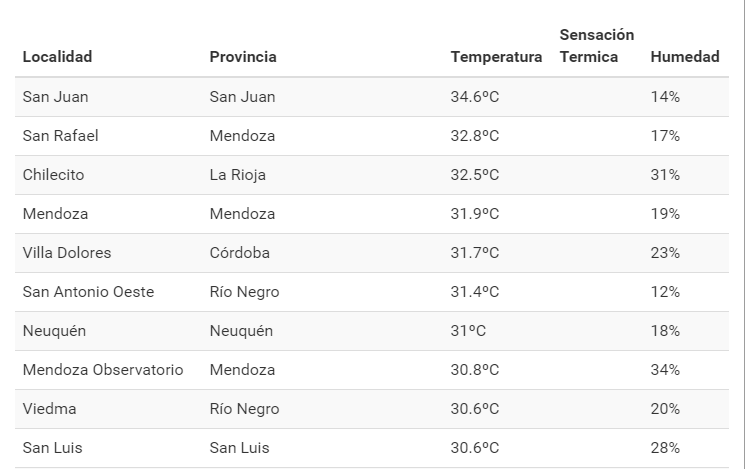 En segundo lugar estuvo San Rafael, de Mendoza con 32.8ºC y cerrando el podio, Chilecito, de La Rioja con 32.5ºC.