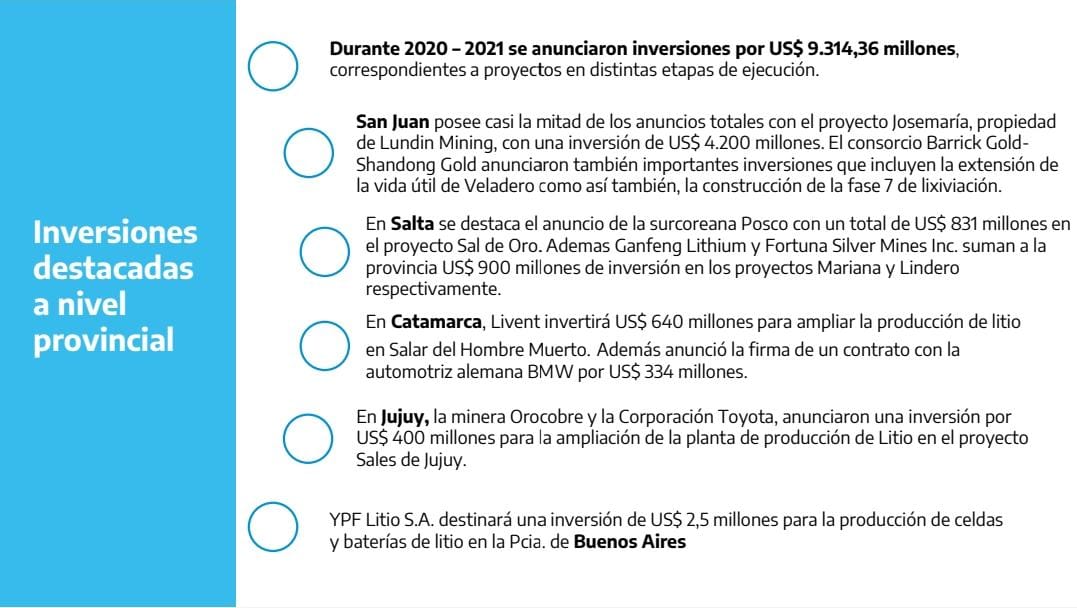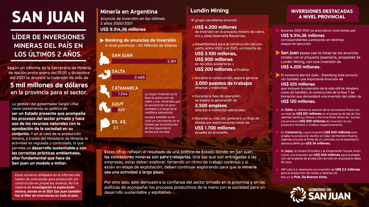 Entre enero del 2020 y diciembre del 2021 las inversiones mineras anunciadas en el país totalizaron 9.314,36 millones de dólares, de esta cifra 5.181,7 millones de dólares corresponden a San Juan, y con este 55,6 % la provincia lidera el ranking nacional de inversiones mineras, según cifras aportadas por la Secretaría de Minería de la Nación.