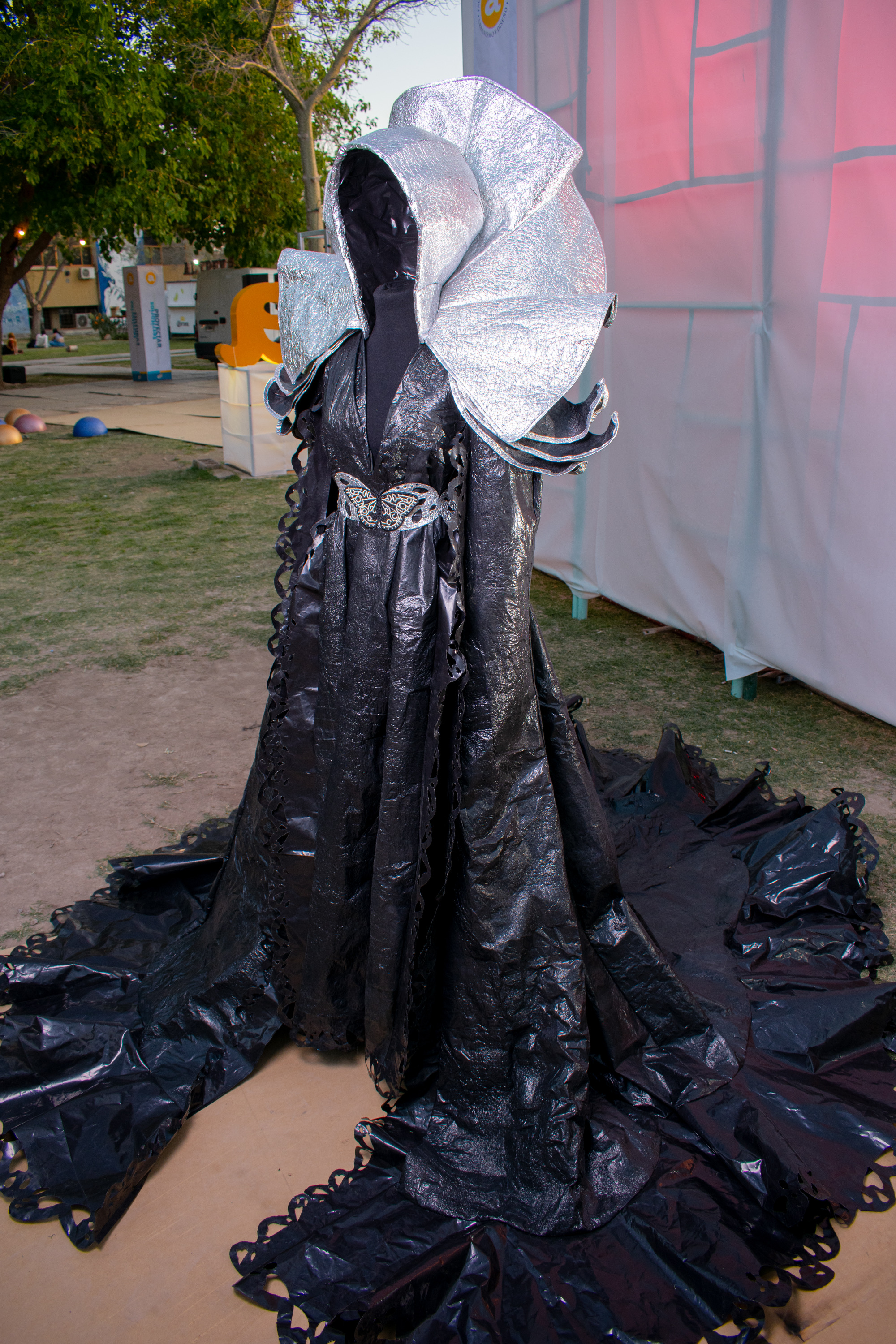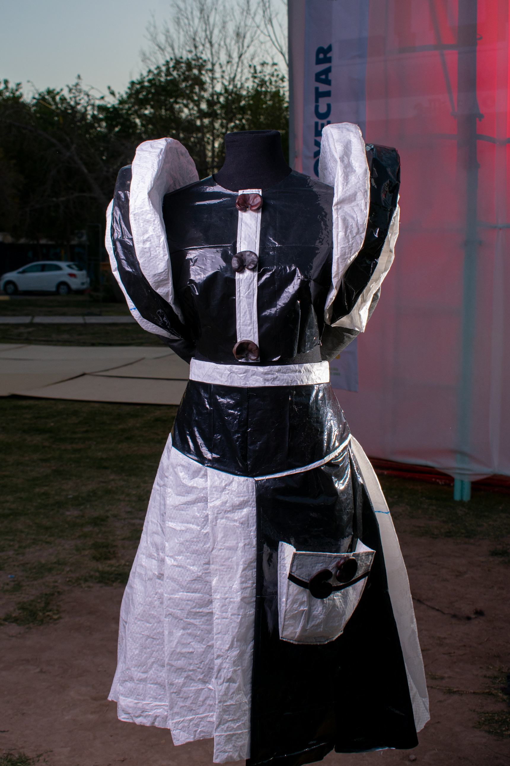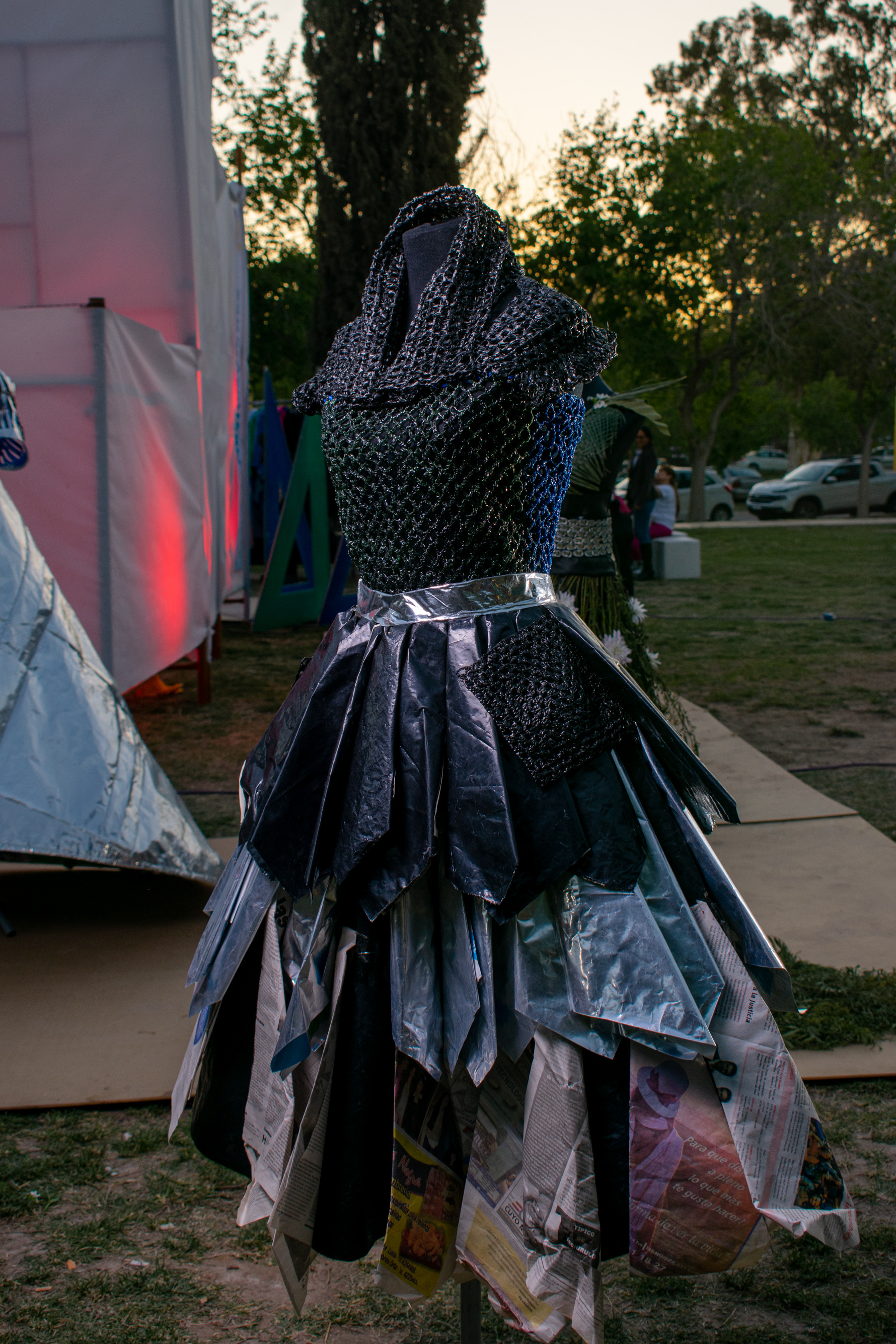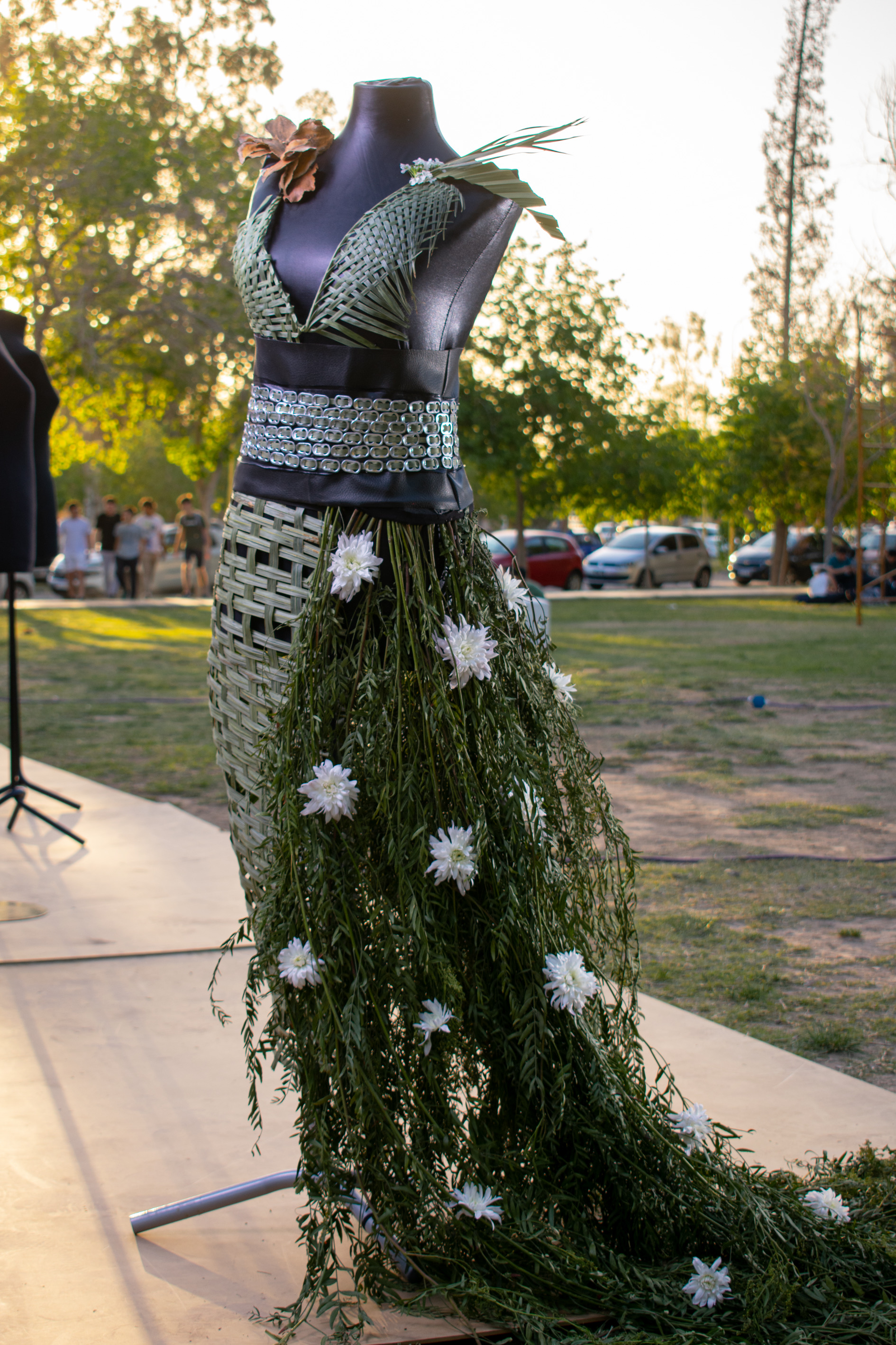 "Daniela Ortega cuenta además, que es la presidenta de la "Asociación Civil Estilo San Juan" junto a Francisco Zito, esta asociación agrupa a todos los diseñadores y artesanos dedicados a la producción y generación de moda de la provincia de San Juan. Esto cuenta con una personería jurídica para poder dar capacitaciones desde nosotros o poder articular con otros profesionales para que vengan a dar sus experiencias. El único objetivo es buscar profesionalizar, tener conocimientos y poder emprender. Junto a mi coequiper Francisco decidimos traer la sustentabilidad a la asociación empezar a trabajar con conciencia y con criterio. Este eje sustentable al desarrollar la diplomatura lo traslade en todos sus tipos, por ejemplo desde armar un molde, desde el desecho textil, la moda circular, etc. Luego apareció la invitación al evento del aniversario de la facultad para participar. Así es como entre los dos, se da origen a una revelación artística, "que si no cuidamos el medio ambiente, si no cuidamos lo que estamos usando nos vamos a vestir con esos desechos". La idea fue presentada a los alumnos que entusiasmados salieron en búsqueda de los materiales, por ejemplo las bolsas de alimento para perros, la malla plástica de construcción, bolsas de residuo, cartones corrugados desechados, latitas de gaseosas o cervezas, entre otros. Hacer la "Colección 2050 fue una transición hermosa, una experiencia super enriquecedora, ya que toda la muestra está hecha con productos reciclados. Un logro de parte de los alumnos ya que venían trabajando con conocimientos e investigaciones todos los elementos visuales de las composiciones, las siluetas, las formas, es decir un proceso de estudio bastante grande que había que volcarlo al diseño. Todo tiene un por qué y está fundamentado en cómo se uso y las formas y siluetas que lograron.
