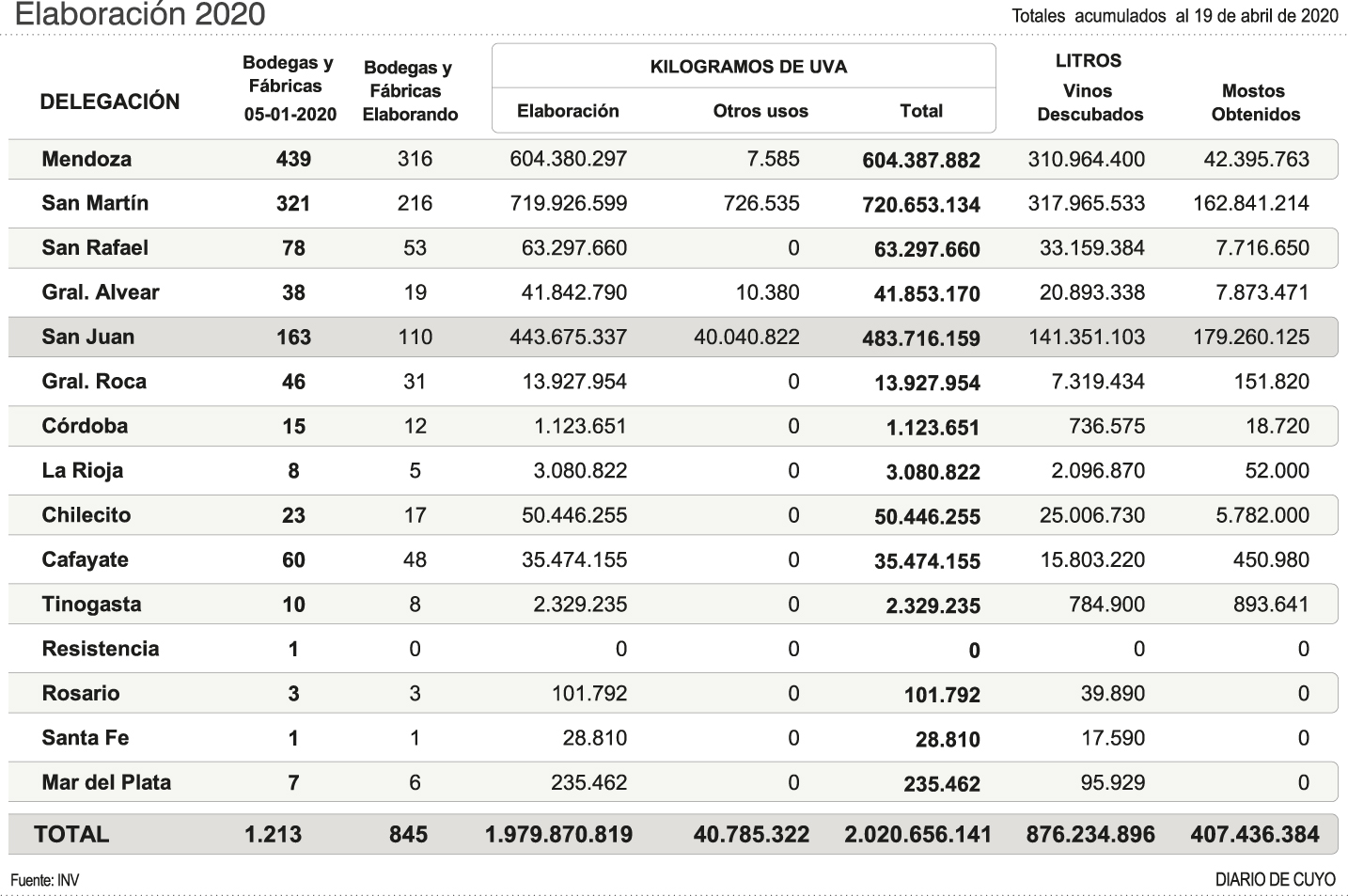 También el informe del Instituto Nacional de Vitivinicultura publicó este año, decisión de la nueva gestión a cargo del mendocino Martín Hinojosa y el sanjuanino Hugo Carmona Torres, el detalle de la cosecha por provincia y variedad, algo muy acertado y que valora el sector productivo, puesto que posibilita saber en detalle algo muy importante a la hora del comercio de las uvas o realización de maquilas. Valiosa información que siempre pone luz para el equilibrio en el mercado.