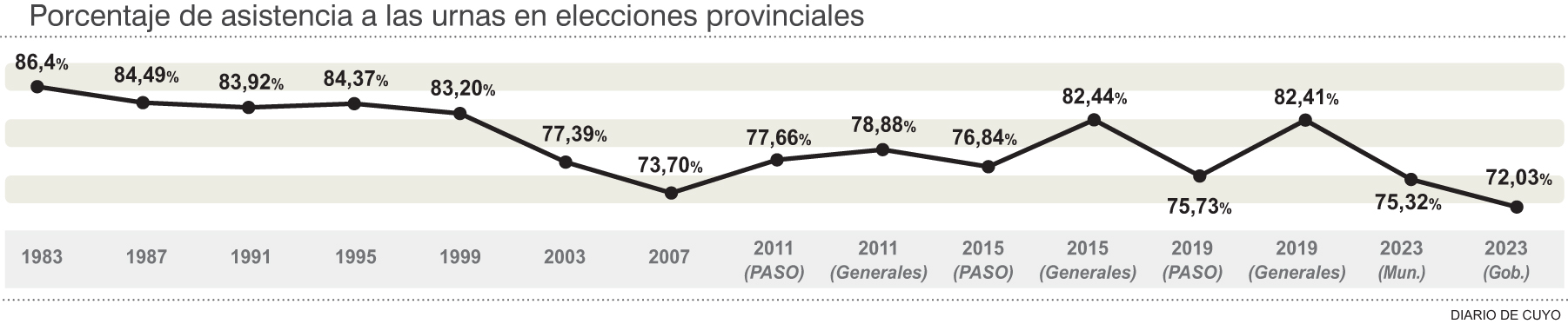 En la elección provincial del pasado 2 de julio votó el 72,3% del padrón y quedó registrado como el menor porcentaje histórico hasta este domingo cuando el piso cayó a 69,5%, de acuerdo a los datos preliminares.