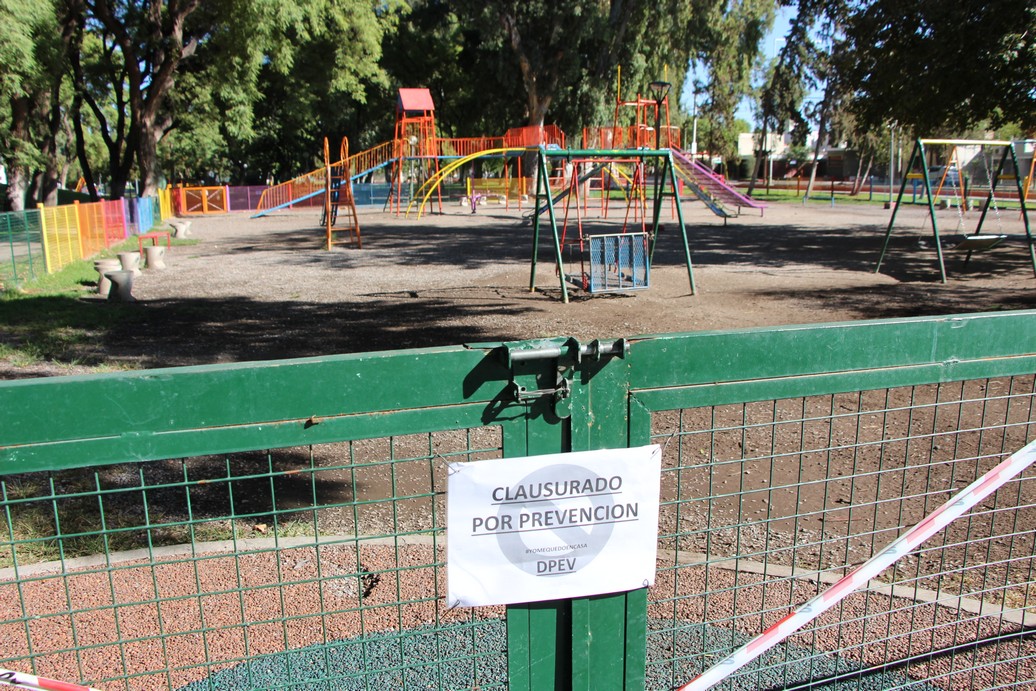 Ya no se escucha el sonido de los juegos infantiles, a los que no se puede acceder por las rejas cerradas que sostienen un cartel que indica: “Clausurado por prevención. #YOMEQUEDOENCASA”.