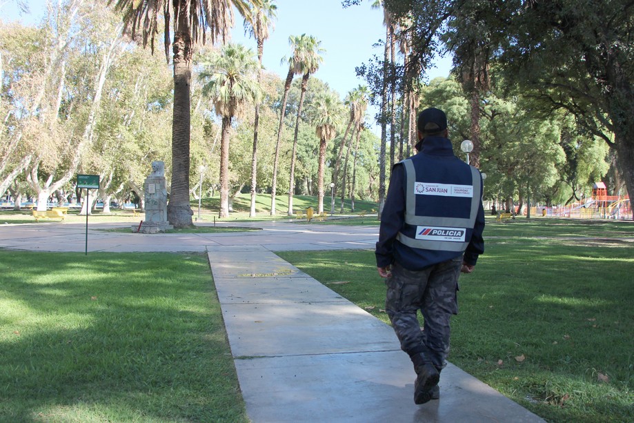 Su tarea es igual a la que desarrollan otros tres efectivos, que desde temprano pusieron en alerta a los deportistas que diariamente usan el espacio verde como epicentro de sus actividades y las familias o grupos de amigos que se sientan en el pastito a pasar el rato.