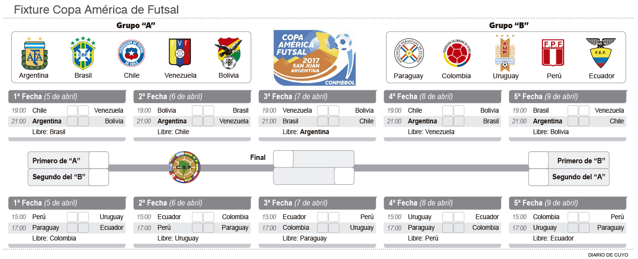 Pero mañana empieza la acción y con los seleccionados en su mayoría ya instalados en San Juan, es bueno repasar los horarios, partidos y entradas para disfrutar lo mejor del futsal del continente en el Cantoni. Serán dos zonas con 5 equipos cada una, donde jugarán todos contra todos para clasificar los dos primeros a las semifinales, remarcando que el día libre será el lunes 10.