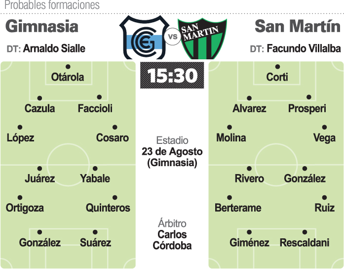 En los nombres, San Martín volverá a repetir los once que golearon el domingo pasado, tras la renovación obligada por la salida de Cozzani y la separación del plantel de varios jugadores más. Así, obligado, el técnico Villalba encontró respuestas más anímicas que de otra especie, dándole continuidad a una formación que la fecha pasada presentó como único cambio el regreso de Leonardo Corti al arco. El resto, fue igual y le dio réditos. Hoy, en San Salvador, la apuesta será idéntica con los mismos titulares. Corti y su veteranía en el arco; Molina y Gastón Vega como laterales en defensa más la buena labor conjunta de Álvarez y Prósperi como centrales. En el medio, el dúo central de Rivero y Maxi González no se toca y el vértigo de Berterame por derecha más la sapiencia de Ruiz por la izquierda terminan de darle los condimentos necesarios al armado y recuperación. Arriba, la potencia de Rescaldani y la entrega de Giménez lo hacen peligroso.
