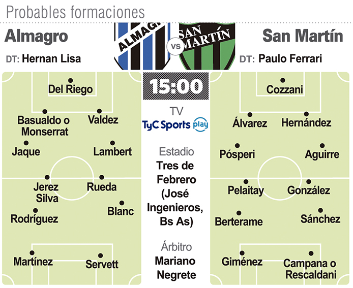 En el mediocampo, Berterame y Sánchez irán por los extremos mientras que en la dupla de volantes centrales, Pelaitay y González serán los encargados de el equilibrio y la recuperación. Esto es hoy San Martín y Ferrari apuesta a consolidar esa formación sabiendo que no será sencillo hacer pie en el estadio "Tres de Febrero" porque las urgencias de Almagro son mayores tal vez a las de San Martín.