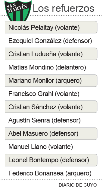 En el repaso del rearmado Verdinegro, San Martín incorporó hasta ahora dos arqueros, cinco volantes, cuatro defensores y un delantero. Un repaso que implica que la búsqueda se orientará ahora a traer más elementos en ofensiva tras la salida del goleador Matías Giménez que pasó a Independiente de Avellaneda. Ahora si ya tomó cuerpo el nuevo San Martín con nombres para el arco, varios más para la defensa y el mediocampo, aunque con poco para elegir en el ataque. Un nuevo plantel para afrontar otra exigente temporada que no admite errores.
