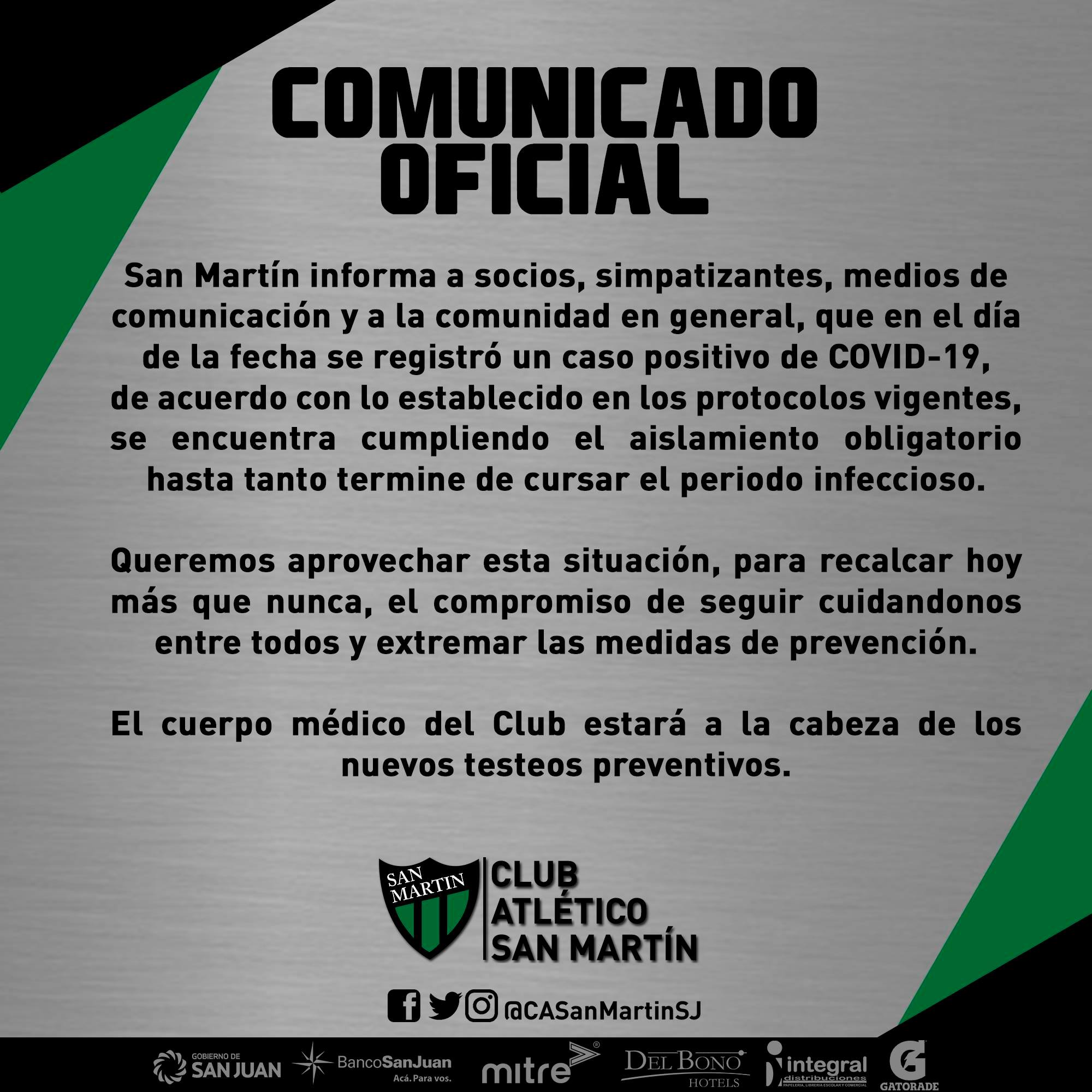 Pasadas las 19 de este sábado, el Club Atlético San Martín informó a través de sus redes sociales que detectó un caso de coronavirus, el primero desde que se desató la pandemia.