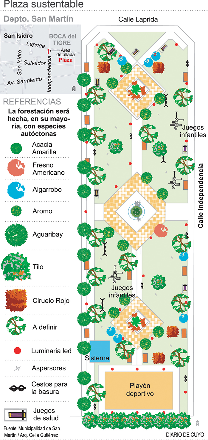 La palabra sustentabilidad, tan usada por estos días debido a que el planeta lo pide a gritos, comprende "la habilidad de lograr prosperidad económica sostenida en el tiempo protegiendo al mismo tiempo los sistemas naturales y proveyendo una alta calidad de vida para las personas". Por ese motivo es que este espacio que iniciará obras antes de fin de año contempla desde juegos realizados con materiales reciclados, paneles solares, y espacios para elaboración de compost, contenedores con clasificación de residuos, y sobre todo cartelería referida a las normas del cuidado del medio ambiente. A esto se sumará la implantación de árboles como acacia amarilla, fresno americano, aromo, aguaribay, tilo y ciruelo rojo, que demandan poca cantidad de agua para su crecimiento y se adaptan a las condiciones climáticas de la provincia. Claro que ahí no terminan las cosas, la sorpresa es que también se plantarán membrillos y cítricos para su aprovechamiento, no sólo a nivel de producción de dulces sino también para el compost.