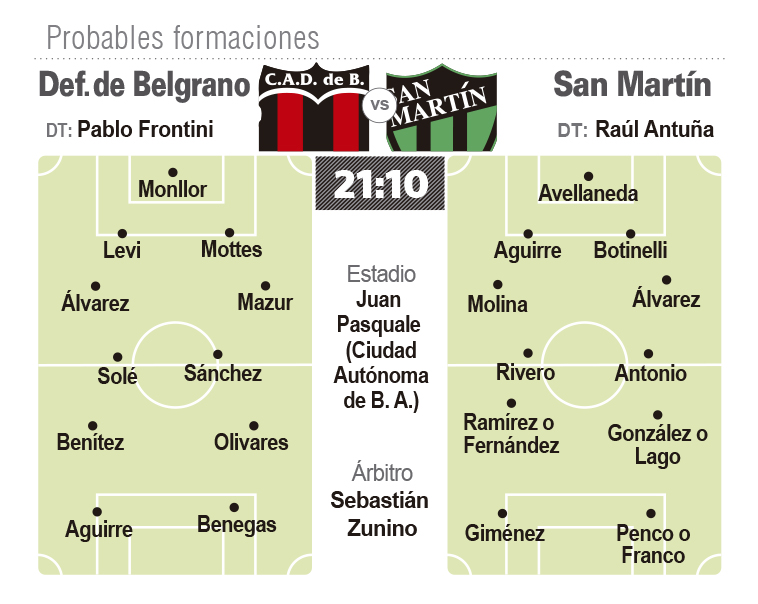 Con algunas dudas en los nombres pero sabiendo que la necesidad es volver a sumar, San Martín se presentará ante un agrandado Defensores de Belgrano que ya igualó la línea de puntaje del Verdinegro y viene de meter dos victorias consecutivas ante Estudiantes de Buenos Aires y luego contra Atlanta. Pero hoy el gran rival de San Martín es el propio San Martín que dejó pasar dos fechas sin sumar y hoy necesita esos puntos para consolidar su lugar en el Reducido, sabiendo que hoy está 9º con 38 puntos pero a solo tres unidades ya está el 14º que es Deportivo Madryn con un partido menos. En lo futbolístico, el técnico Raúl Antuña trabajó intensamente en la búsqueda de la recuperación anímica de un grupo que sintió el impacto tras la derrota contra los tucumanos pero además, probó algunos retoques desde lo táctico buscando recuperar la fisonomía ganadora de un equipo al que le está costando definir lo que genera. En los nombres, la formación no ha sido confirmada ni mucho menos pero se especula con la presencia de Sebastián Ramírez como compañero de ataque de Matías Giménez y la chance de tener a Pablo Ruiz como volante derecho para darle otros tiempos al manejo de la pelota. Los que podrían salir serían Ignacio Lago y Tomás Fernández, aunque también podría salir Sebastián González. Todas especulaciones que recién quedarán confirmadas hoy en la previa inmediata.