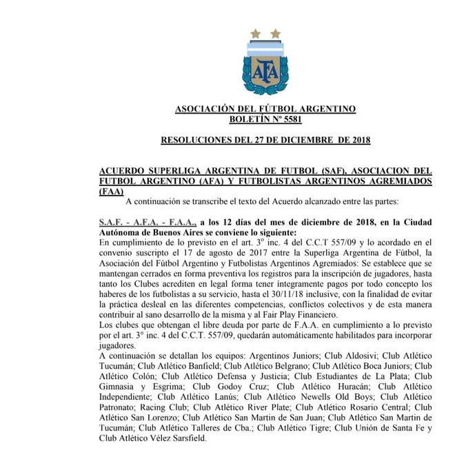 La Superliga recordó que los equipos que mantengan deudas con sus jugadores hasta el 30 de noviembre último no podrán abrir los registros para fichar a posibles refuerzos. Esta medida ya estaba planteada en el convenio que se firmó en agosto de 2017 entre la organización, la AFA y Futbolistas Argentinos Agremiados.