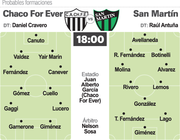 Enfrente estará el Chaco For Ever del Chango Daniel Cravero. Llegado desde el ascenso del Federal A pasado, el equipo de Resistencia hoy está en zona de Reducido con 52 puntos pero necesitará también ganarlo porque en la última jornada quedará libre con todo el riesgo que eso implica. Varios serán los cambios que pondrá en cancha Chaco. Los siete distintos, con respecto al partido ante Atlanta son: Canuto y Valdez (vuelven de cumplir sanción); Gaggi, Gómez, Lucero, Garnerone y Giménez. Mientras que no estarán desde el arranque Joaquín Mattalía, Alexis Niz, Gaspar Triverio, Diego Sánchez Paredes, Díaz, Leandro Allende (lesionado) y Claudio Vega. Además, el partido marcará la despedida del fútbol de Oscar Gómez, el histórico volante central que estará en cancha un puñado de minutos. Es el partido del año para San Martín. Mucho más que tres puntos, con la ilusión del ascenso en el medio. Ganar de visitante es el gran desafío y hoy puede ser el día de saldar esa deuda para un San Martín que hizo todo para clasificar.