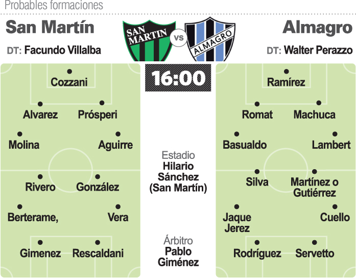 En los nombres y para tranquilidad del entrenador sanjuanino, todo está a disposición y la idea es repetir formación y esquema tratando de desequilibrar el orden que desde el medio propone Almagro. Con dos líneas de cuatro y dos puntas, Villalba tratará de repetir el funcionamiento que le dio réditos ante Defensores cuando Berterame por derecha y Vera por la izquierda hicieron diferencias para poder llegar a posiciones ofensivas. De no mediar imprevistos, San Martín iría con Cozzani en el arco, que viene de contener un penal ante Santamarina; Molina y Jonás Aguirre serán los laterales defensivos, y la dupla Álvarez-Prósperi será la zaga central. En el medio, los externos serán Berterame y Vera, mientras que por el medio, Rivero y Maxi González son número puesto. En el ataque, Ezequiel Rescaldani asoma como la referencia, apoyada por la movilidad de Matías Giménez.