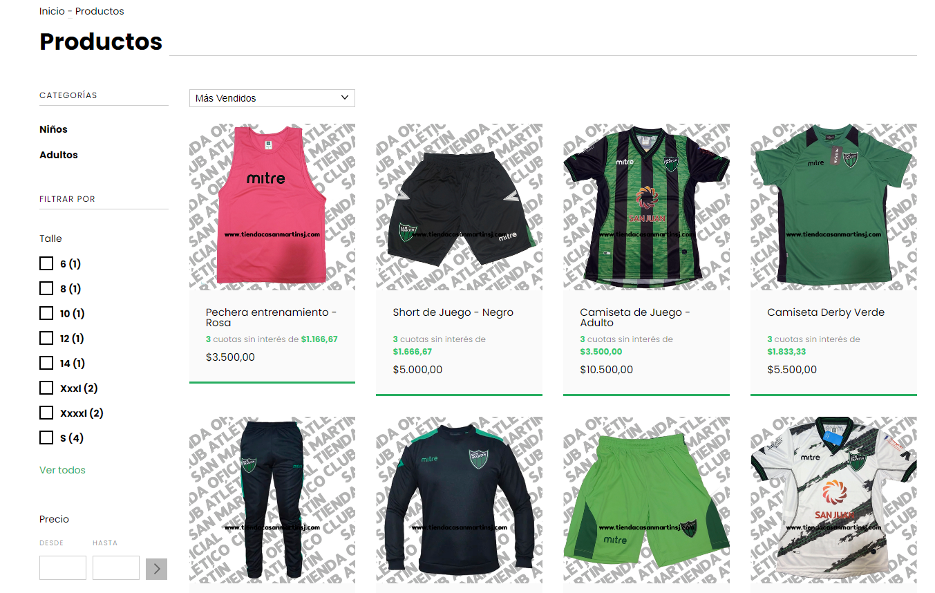 El link para ingresar a la tienda es www.tiendacasanmartinsj.com . La camiseta oficial de adulto tiene un valor de 10.500 pesos, la de niño 7.500 pesos, la musculosa de entrenamiento tiene un valor de 3.500 pesos y el short 5.000 pesos. También hay indumentaria de invierno como buzos, camperas y pantalones. Desde el club informaron que hay stock de talles. Para los hinchas de la provincia que compren indumentaria pueden hacer el retiro sin cargo por la sede del club, solo los días martes y jueves de 18 a 20 horas.