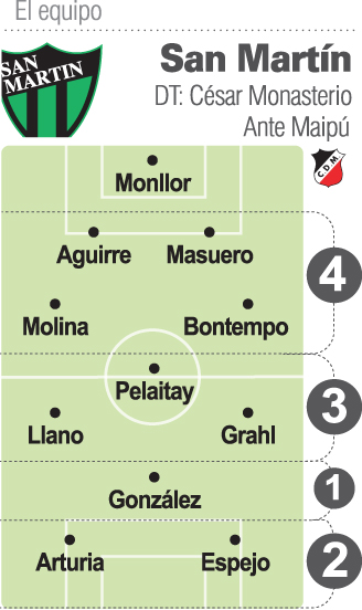 Enfrente, con la tranquilidad de saber que con no perder avanzará, el Deportivo Maipú no tendrá demasiados retoques respecto del partido que perdió de local con Independiente Rivadavia. La probable formación del Cruzado sería con Juan Pablo Cozzani en el arco; Santiago Moyano, Nicolás Agorreca, Imanol González y Guillermo Ferracuti en defensa; Fausto Montero, Agustín Manzur, Luciano Herrera y Rubens Sambueza en el medio; Almirón o Gonzalo Klusener y Santiago González en el ataque. Un rival consolidado que sabe lo que quiere será el que examine las pretensiones de San Martín.