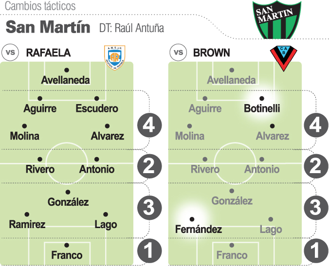 En suelo sanjuanino, en la última práctica antes de emprender el viaje a la ciudad santafesina de Rafaela, en el Atlético San Martín se terminó de definir la formación que irá por una victoria ante La Crema como visitante, con todo lo que le ha costado al Verdinegro poder festejar afuera. El regreso del defensor Matías Escudero y la titularidad para Sebastián Ramírez son las novedades que presentará la formación de San Martín mañana domingo a partir de las 19,30 por la fecha 31 de la Primera Nacional. Escudero, quien había llegado al límite de amonestaciones en el partido contra Chacarita, se perdió el choque contra Brown de Puerto Madryn y ahora, volverá a la zaga central reemplazando al capitán, Jonathan Botinelli quien sumó su quinta amonestación y debe purgar una fecha afuera. Un cambio de nombre por nombre en defensa, que se completa con Augusto Aguirre como el otro marcador central, mientras que Alejandro Molina y Dante Álvarez serán los laterales. En el medio y pese a que Damián Lemos ya tenía rodaje como para regresar a la titularidad, el técnico Antuña se inclinó por mantener la dupla de contención que conformaron en el partido anterior Martín Rivero junto a Ignacio Antonio. Más adelante, en el trío de volantes ofensivos que San Martín viene utilizando, el entrenador sanjuanino decidió otro retoque pero por razones tácticas ingresando Sebastián Ramírez por el costado derecho en el lugar de Tomás Fernández, manteniendo a Sebastián González y a Ignacio Lago como los otros integrantes de esta línea. Arriba, como el modelo lo manda, un solo punta más que consolidado como Nicolás Franco.