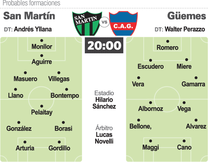 En los nombres, todo indica que el Verdinegro repetiría los mismos once que ganaron ante Patronato con Mariano Monllor en el arco. En tanto que la línea de tres iría con Masuero, Aguirre y Villegas, teniendo abiertos a los laterales Llano y Bontempo. En el medio, los tres volantes serían González, Pelaitay y Borasi, mientras que la dupla ofensiva tendrá a Marcos Arturia y Lautaro Gordillo. Un esquema que se quiere consolidar y que encontró en Paraná ese sustento que solamente lo brindan los triunfos más siendo de visitante. La obligación, el peso del partido, será propiedad de este San Martín que sigue caminando en busca de su identidad. Dependerá de lo que genere, de que vuelva mejorar su volumen de juego y encuentre funcionamiento colectivo para poder resolver este nuevo desafío en San Juan. Arrancó empatando en Mar del Plata, luego no tuvo reacción en Concepción ante Gimnasia y festejó en Entre Ríos. Esa escalera hoy puede convertirse en un peldaño ascendente siempre que liquide el planteo de Güemes que llega a San Juan con el objetivo de sumar y aprovechar, tal vez, las ansiedades del dueño de casa. El último compromiso entre ambos en la Primera Nacional fue el 27 de febrero del año pasado y terminaron igualando 1-1. Hoy, casi un año después, se vuelven a juntar para encarrilar un comienzo de año complejo.