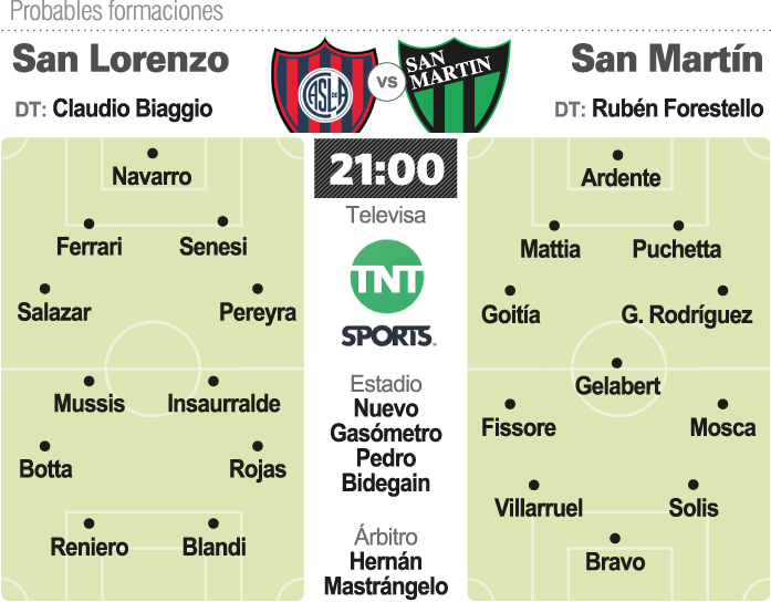 Enfrente estará el opaco momento de San Lorenzo que en este ciclo Biaggio no ha podido consolidar un objetivo concreto. Quedó fuera de Copa Argentina, fuera de la Sudamericana y lejos en la Superliga hoy en la posición 20 y por debajo de San Martín con apenas una sola victoria en 7 partidos. Pero los grandes son eso y adormecido, el Ciclón querrá despertar. En las novedades del equipo del Pampa Biaggio se anota el saliente regreso del goleador Nicolás Blandi ya recuperado de su lesión, mientras que Fernando Belluschi estaría al menos entre los suplentes. Descartados si los históricos Fabriccio Coloccini, Gabriel Rojas y Gerónimo Poblete aún en recuperación, mientras que Manuel Insaurralde debutará como titular en Primera. Además, estará en cancha el sanjuanino Ruben Botta, con toda su categoría, para potenciar a un San Lorenzo que necesita volver a creer.