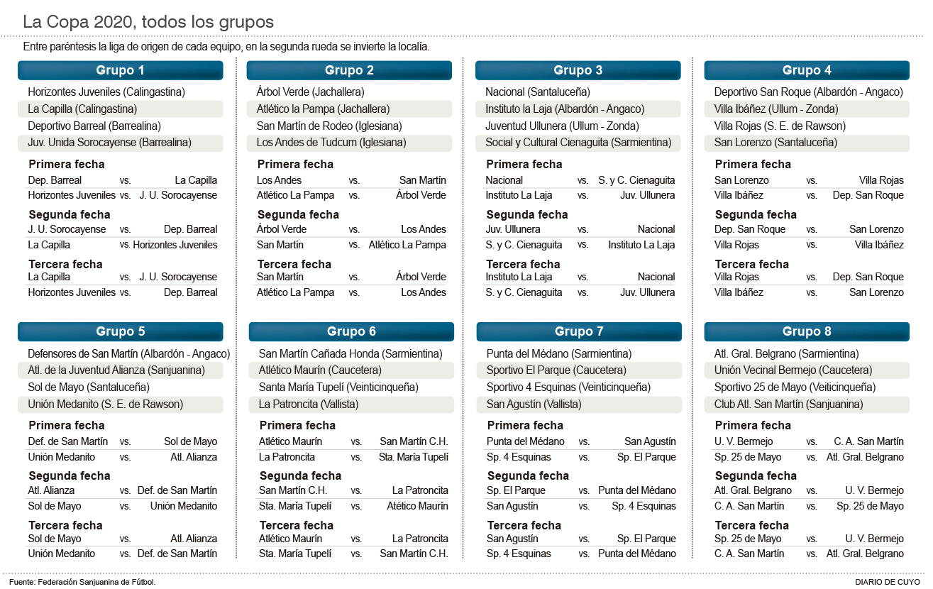 Se podría decir que la Copa de Campeones 2020 ya comenzó. Y es que luego de confirmarse la presencia de Atlético de la Juventud Alianza y del Atlético San Martín -ambos de la Liga Sanjuanina- la última plaza vacante quedó en manos de Atlético Cieneguita de Sarmiento que confirmó presencia y estará jugando su tercera copa desde que se afilió a la liga sureña. Con todo esto, la Federación Sanjuanina terminó de armar el cuadro de los 8 grupos, reunidos por proximidad geográfica. Así, en el Grupo 1 quedaron incluidos los equipos de Calingasta y Barreal, quienes jugarán las seis fechas de la fase clasificatoria para darle nombre a los dos clasificados de ese grupo. En el Grupo 2 están los iglesianos y los jachalleros con una promesa de enorme paridad en esa zona por la calidad de los que están ya que San Martín de Rodeo es el actual campeón y Los Andes de Tudcum ganó en 2018. En el Grupo 3 se anotan Instituto de Albardón, Juventud Ullunera, Nacional de Santa Lucía y Cieneguita de Sarmiento. Para el Grupo 4 quedaron San Roque de Albardón, Villa Ibañez de Ullum, San Lorenzo de Santa Lucía y el debutante Villa Rojas de la Liga Sureste de Rawson. En el Grupo 5 aparece uno de los grandes: Atlético Alianza. El Lechuzo compartirá grupo con Defensores de San Martín de la Villa Mariano Moreno, Sol de Mayo de Santa Lucía y Unión Medanito de Rawson.