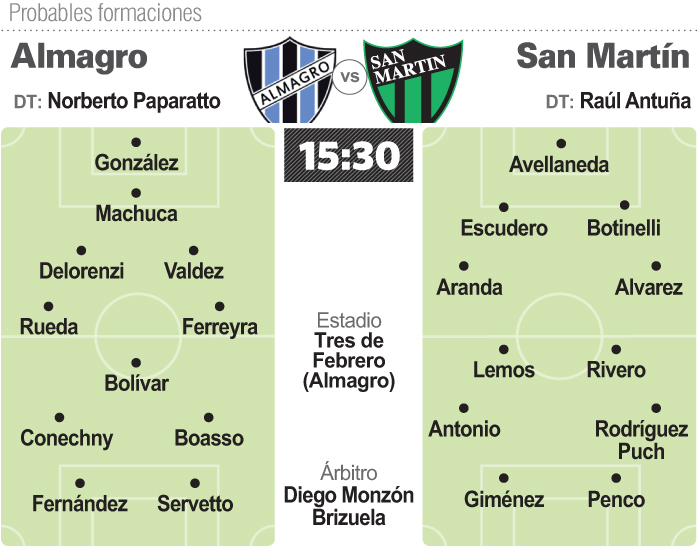 Del otro lado estará el Almagro de Norberto Paparatto que viene de igualar con Atlanta y repetiría modelo y nombres para buscar su triunfo contra San Martín.