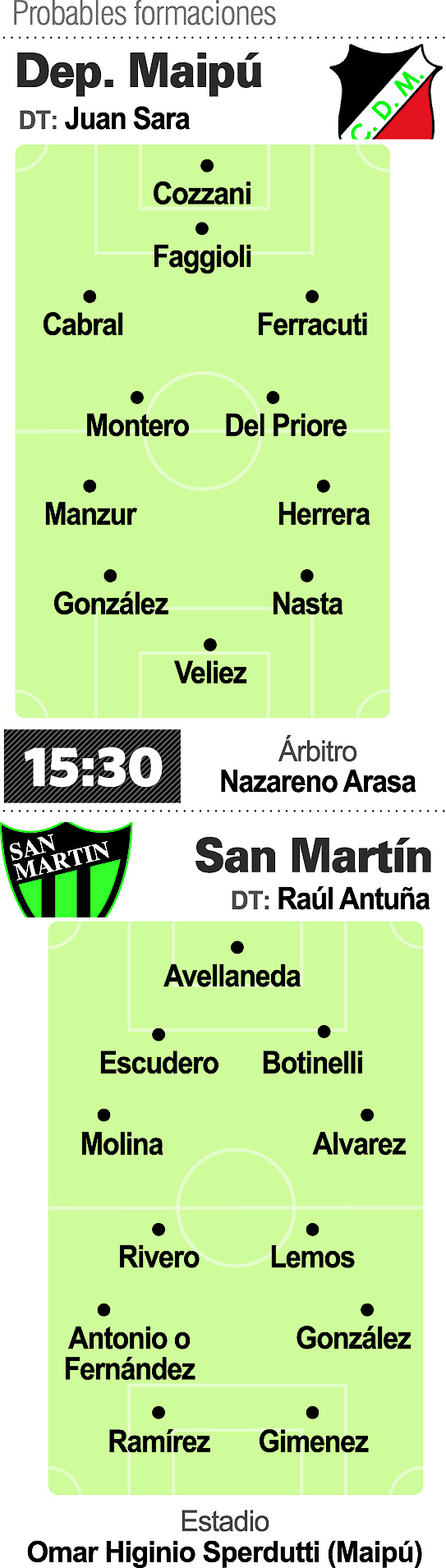 Del otro lado estará el Maipú de Juan Sara que viene de empatar como visitante ante Atlanta y está por debajo apenas a un punto de San Martín en las posiciones. El Cruzado hará dos cambios respecto del partido pasado: Álvaro Veliez por Castelli en el ataque y Agustín Manzur por Pierce en el mediocampo. San Martín está necesitando romper era racha adversa. Jugar en Mendoza, contra un equipo complicado y en una cancha que tiene lo suyo. Con todo eso, parece ser el momento de quiebre para este San Martín que desde la primera fecha y después de 16 jornadas tratará de ganar afuera de San Juan. La última victoria en esta temporada fue precisamente en Mendoza y ante Gimnasia de Mendoza. Maipú es el desafío y está planteado así. Curiosidades que ayudan a ilusionarse con una victoria Verdinegra en un nuevo clásico, sabiendo que será más especial que nunca.