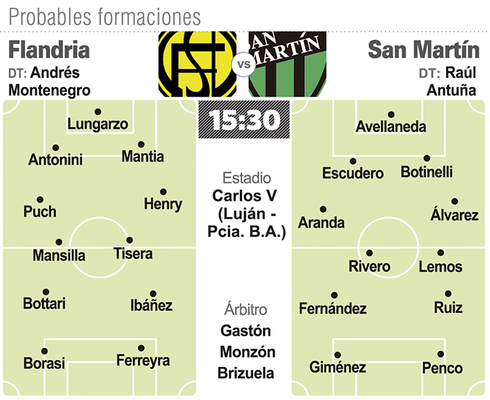 En San Martín, el relanzamiento de la campaña 2022 parece tener ya resuelto el tema de hacerse fuerte de local y hoy, la deuda está en encontrar la fórmula para volver a hacerse fuerte de visitante. Con ese objetivo, hoy desde las 15,30 el Verdinegro afrontará uno de esos partidos que pueden servir para sacarse esa espina cuando visite a Flandria en partido válido por la novena fecha de la Primera Nacional. Con dos victorias como local y una derrota de visitante en este microciclo de Antuña como interino, San Martín necesita resolver la faceta de ser visitante si es que pretende consolidar su proceso de reconstrucción. Ese es el gran objetivo para visitar al Canario que está hundido en el fondo de las posiciones, con apenas una victoria y cinco derrotas. Parece ser el rival ideal para las necesidades de San Martín que de visitante arrancó ganando en Mendoza, luego empató en Santiago del Estero y por último perdió en Córdoba y en Isidro Casanova. Para intentar ese paso, el entrenador Raúl Antuña volvió a ratificar los mismos nombres que decidió desde su primer partido con el mismo esquema, con los mismos titulares. Una apuesta fuerte que pasa por el lado de la confianza y que se sostiene en la última producción que terminó con goleada 3-0 sobre Gimnasia de Jujuy en el Pueblo Viejo. Así, San Martín tratará de recuperar esa senda ganadora fuera de San Juan con Nicolás Avellaneda en el arco; la defensa será la misma con Pablo Aranda y Dante Álvarez como laterales y la zaga central de Matías Escudero con Jonathan Botinelli. Para el mediocampo, la propuesta insiste con Tomás Fernández por derecha y a Pablo Ruiz como generador recostado por la izquierda, quedando por el centro Damián Lemos con Martín Rivero más suelto. Finalmente, el ataque tendrá a Giménez y a Penco inamovibles.