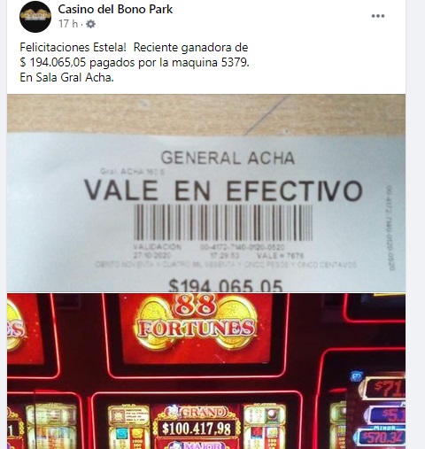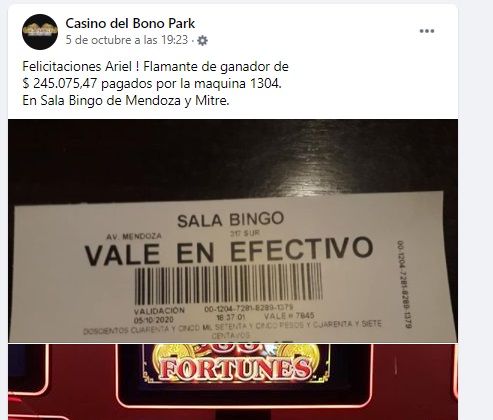 Una mujer ganó 194 mil pesos en el tragamonedas, premio poco habitual en este tipo de juegos. El antecedente inmediato es del 5 de octubre, donde un hombre se quedó con 245 mil, en el Bingo de calle Mendoza.