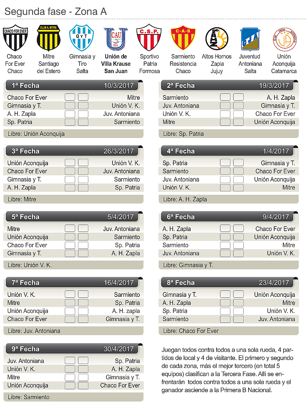 En esta Segunda Etapa estarán los primeros y segundos de cada zona clasifican a la Segunda Etapa. Si alguno de éstos al finalizar esta etapa en cada una de las zonas, se encontrase comprendido en el régimen de descenso estará impedido de participar en la siguiente etapa.