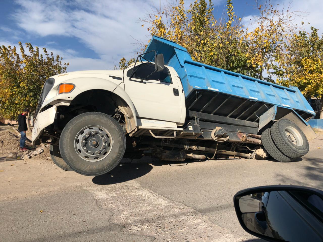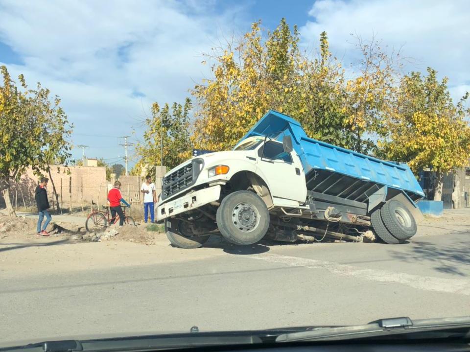 Según los testigos, el camión circulaba por la zona y en esa parte de la calzada, el pavimento cedió y el rodado quedó incrustado en el pozo que se formó.