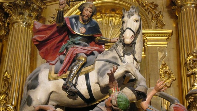 Después de evangelizar a España, Santiago regresó a Palestina en el año 44. Allí fue torturado y decapitado por Herodes Agripa. Cuenta la leyenda que sus discípulos habrían llevado su cuerpo hasta Galicia donde lo habrían enterrado. La tumba de Santiago Apóstol fue olvidada por más de 800 años. En el año 813, un ermitaño llamado Pelagio observó resplandores y escuchó cánticos en el lugar donde se encontraban los restos del Apóstol. Informado el Rey Alfonso II, acudió al lugar y proclamó al Apóstol Santiago patrono del reino, edificando allí un santuario que mas tarde sería la Catedral. La colectividad española en San Juan le rendirá homenaje al Santo Patrono de España, hoy, con una oración que compartirá cada uno desde sus respectivas viviendas, es decir con un encuentro virtual que reunirá a todos los devotos.