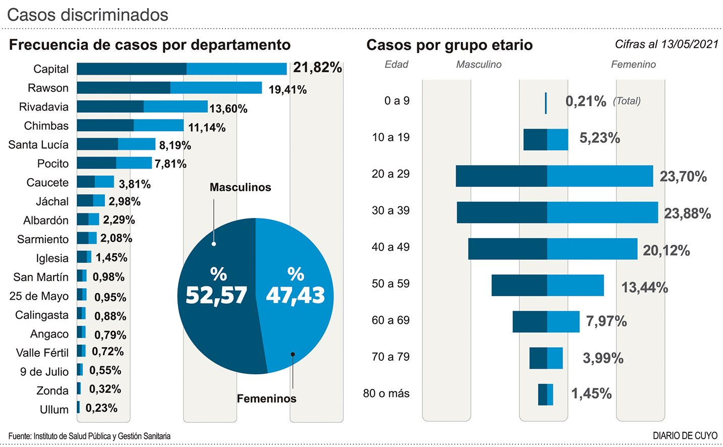 Hasta el 15 de abril pasado, Sarmiento agrupaba al 1,21% del total de casos en San Juan, es decir, unos 300 infectados en el acumulado. Y en casi un mes saltó al 2,08%, es decir, unos 672 sarmientinos contagiados. La brecha fue nada menos que de 124%, para convertirse en el departamento donde porcentualmente hubo mayor crecimiento de casos.