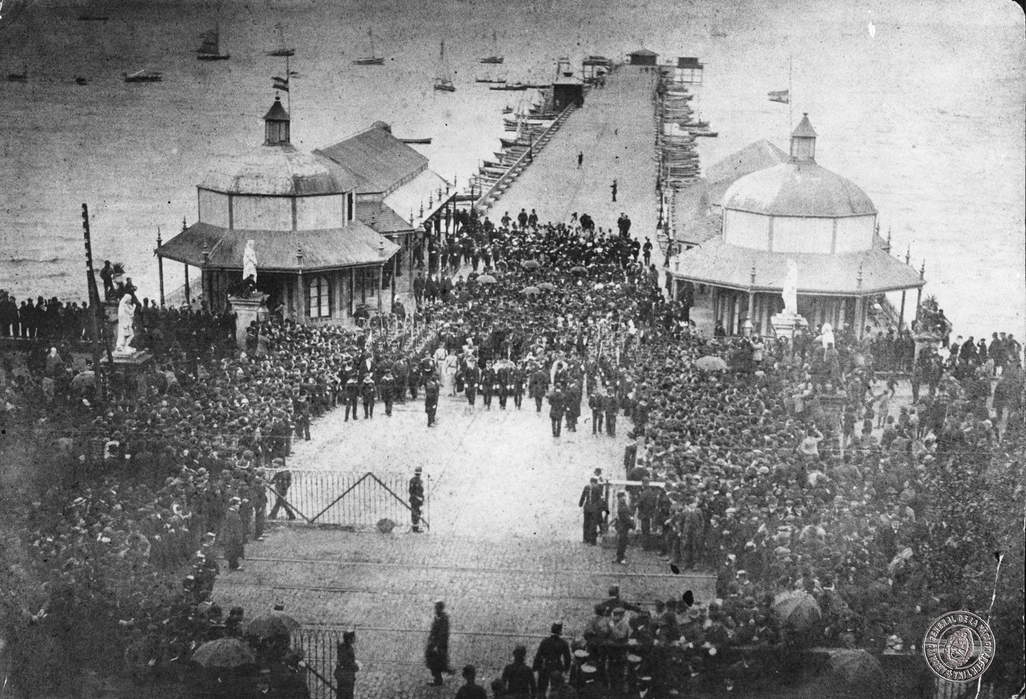 Esta foto histórica muestra la llegada de los restos del prócer Domingo Faustino Sarmiento a Buenos Aires, ante una gran concurrencia.