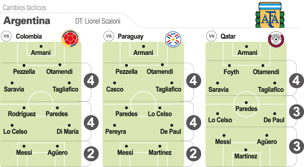 En la fecha del debut ante Colombia, Argentina saltó al campo de juego con esquema elástico: Paredes y Guido Rodríguez compartieron el eje del campo, Lo Celso apareció por derecha (con su tendencia natural a cerrarse y combinarse con Messi) y Di María, por izquierda. Fue un primer tiempo para el olvido y el DT lo entendió. Cambió a Di María por Rodrigo De Paul y si bien el ingreso le dio otro aire, continuó sin darle resultados y la impotencia otra vez se apoderó de la Albiceleste.