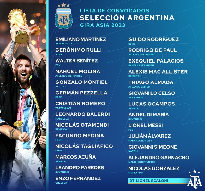 Por otra parte, la lista de Scaloni para la gira por Asia tiene algunas bajas importantes en relación al plantel que conquistó el Mundial: no está Franco Armani, tampoco Lisandro Martínez -algo que ya se sabía- por lesión y tampoco aparece Lautaro Martínez, que hará un tratamiento especial para recuperarse de su tobillo.