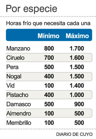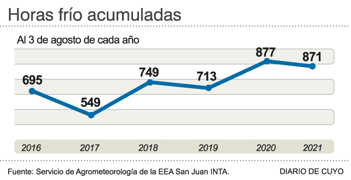 El Servicio de Agrometeorología de la Estación Experimental Agropecuaria San Juan del INTA contabilizó hasta el 3 de agosto pasado una acumulación de 871 horas frío, una cifra levemente inferior (-0,69%) a las 877 del año pasado, pero más que suficiente para el agro. Sonia Silva, a cargo de relevar y difundir este servicio en el INTA, recordó que la cantidad de horas frío se cuentan por el tiempo que el termómetro está por debajo de los 7,2´C. Rodrigo Espíndola, especialista del INTA, dijo que los viñedos normalmente tienen bajos requerimiento de horas frío, con temperaturas por debajo de 7´C y por encima de 0´C. El ingeniero agrónomo Hugo Carmona, titular de la delegación del Instituto Nacional de Vitivinicultura, corroboró ese dato y amplió a que con la cantidad de horas registrada hasta ahora es suficiente para el resto de los cultivos que hay en la provincia como el olivo, el pistacho, almendras y otros frutales. ""Las horas frío siempre se cuentan desde el punto de vista agronómico, y con la cantidad que hay hasta el momento ya están cumplidas las horas necesarias", dijo Carmona. Explicó que cuando pasan una cantidad de horas, dependiendo de la especie y la variedad, las hormonas que inhiben la brotación se eliminan y la planta está en condiciones de volver a iniciar un ciclo vegetativo nuevo, es decir una brotación y floración. ""Si la acumulación es insuficiente la brotación será despareja y eso traería pérdidas en la producción", advirtió.