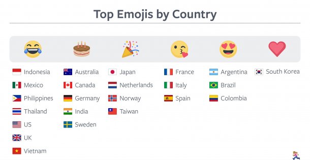 Entre los más populares, en España, Francia e Italia el más común es el emoji del beso mientras que en Argentina o Brasil es el emoji con corazones en los ojos, y en México y Estados Unidos es el emoji de lágrimas de risa.