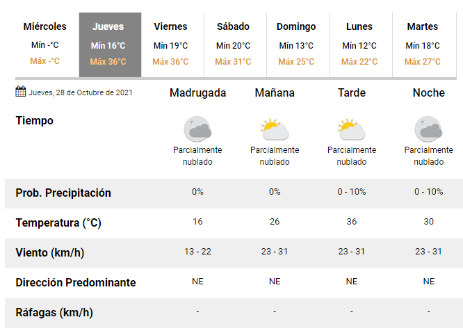Por lo pronto, continuará soplando viento del sector noreste, con lo que continuarán reinando las altas temperaturas. En un día nublado, el jueves tendrá una mínima prevista será de 16 grados y la máxima, de 36 grados.