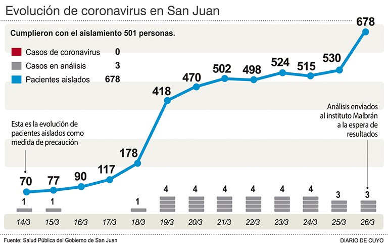 El último parte del miércoles había dado cuenta de 530 pacientes aislados en la provincia, pero ayer ese número creció de golpe a 678. Son sometidos a este aislamiento, en centros de salud o en sus propios domicilios, quienes tuvieron algún síntoma pero no llegan a ser casos sospechosos. Los que sí lo son, en cambio, son personas que estuvieron en zonas de mucha presencia del virus. En este momento hay tres casos sospechosos en San Juan y sus análisis, a realizarse en el Instituto Malbrán, aún no lanzan un resultado.