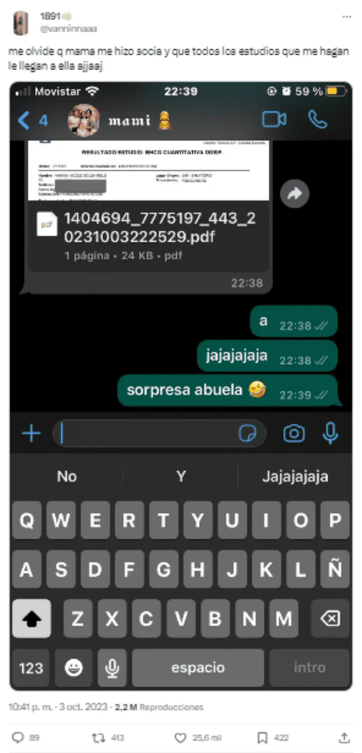 Al recibir los estudios que confirmaban el embarazo, se los reenvió a la autora de la publicación para obtener una respuesta sobre lo acontecido, motivo por el cual la joven le mandó, entre risas, la frase: “sorpresa, abuela”.