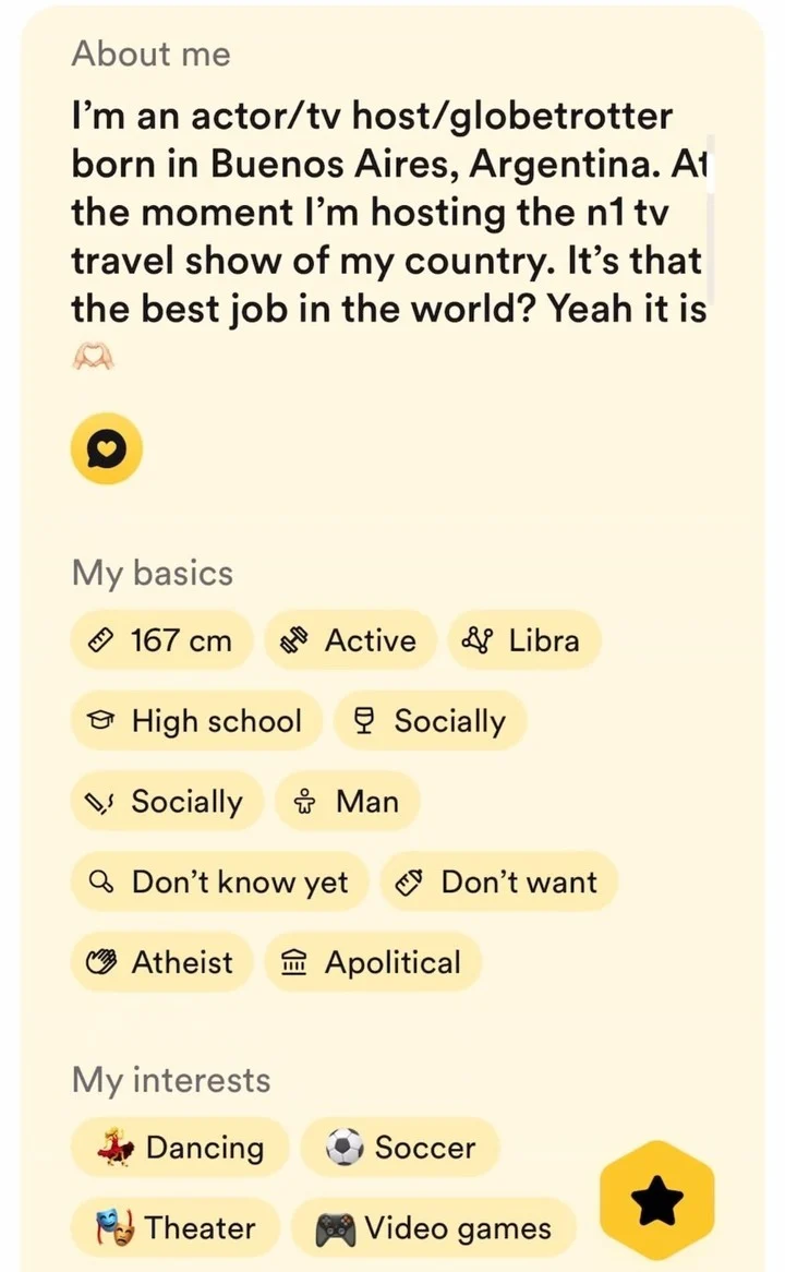 Luego, en las categorías preestablecidas que ofrece la misma aplicación, el conductor especificó que tiene 33 años, mide 1,67 metros, que hace ejercicio, que es del signo Libra, que bebe alcohol y fuma tabaco socialmente, que aún no sabe qué tipo relación amorosa busca, que no quiere hijos, que es ateo y que es apolítico.