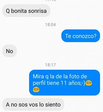 “Qué bonita sonrisa”, comenzó escribiendo. Y luego hizo preguntas para asegurarse de estar chateando con la niña: “¿Es tuyo el Face o lo usa tu mamá? ¿Ella te lee los mensajes?”. La madre, al notar que estaba ante un probable abusador de menores, decidió seguir el juego para poder escracharlo.