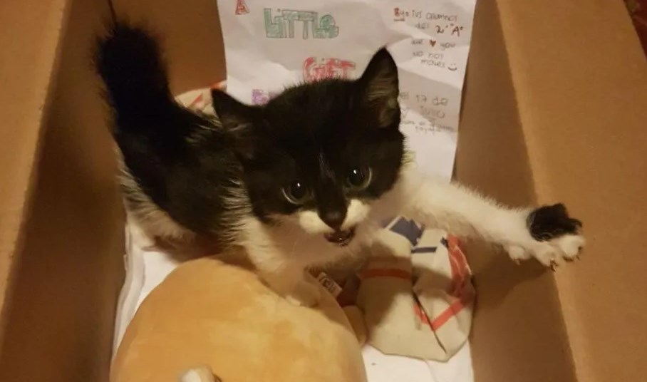 Acto seguido, le entregaron un gatito blanco y negro en una caja de cartón. Ante este tierno gesto, la maestra expresó: "El doble estoy llorando ahora".