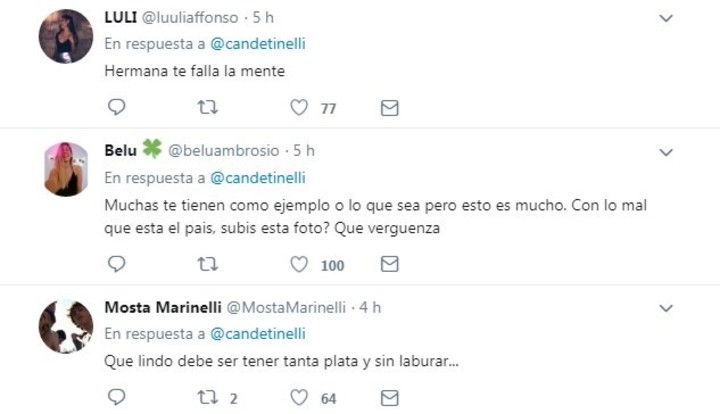 Como era de esperar, las publicaciones generaron mensajes de odio y un fuerte repudio. "Muchas te tienen como ejemplo o lo que sea pero esto es mucho. Con lo mal que esta el país, ¿subís esta foto? Que vergüenza" y "Que lindo debe ser tener tanta plata y sin laburar…", fueron algunos de los comentarios que recibió.